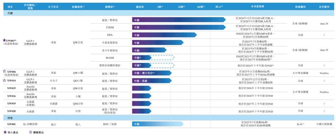 第二个战略层次瞄准“不远的将来”,核心里程碑事件是口服版GLP-1药物XW004和XW014的顺利上市。当前,传统注射类GLP-1药物竞争已进入白热化阶段,口服剂型凭借便捷性、患者依从性高的优势,成为GLP-1赛道下半场的决胜关键。根据已公布的临床数据显示,XW004在6个月内实现了6.8%的减重效果,显著优于司美格鲁肽同期的2.3%以及礼来orforglipron的4.3%,展现出强劲的市场竞争力。